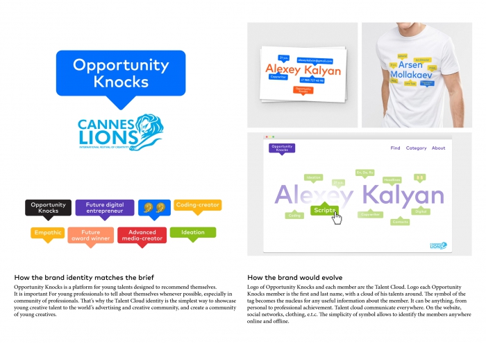 Участники номинации Design должны были создать айдентику для организации Opportunity Knocks. Ежегодно выпускники сталкиваются с проблемой пытаясь найти работу. Фестиваль Cannes Lions с помощью Opportunity Knocks хочет помочь молодым людям решить эту проблему, и приглашает выпускников в творческое сообщество Cannes Lions, где их талант точно заметят и оценят.