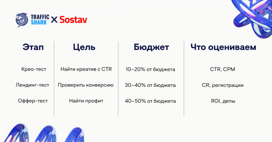 - Следуйте структуре — разделяйте тест на этапы (крео → лендинг → оффер), распределяя бюджет и фокусируясь на релевантных метриках.