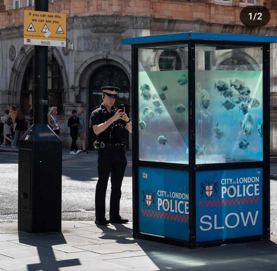 Подписчики шутили, что на седьмой день Бэнкси будет отдыхать, но он об этом даже и не думал. К утру полицейская будка в центре Лондона превратилась в гигантский аквариум с пираньями. Бэнкси подтвердил авторство в своем Instagram* — на фото полицейский снимает работу на телефон. В кадр также попала надпись «If you can see this, we can see you» на столбе. Яркий аквариум не похож на предыдущие граффити ни по технике исполнения, ни по цветовому решению, ни по степени детализации. В комментариях пользователи увидели отсылку к «Скотному двору» Оруэлла. Они явно его не читали.