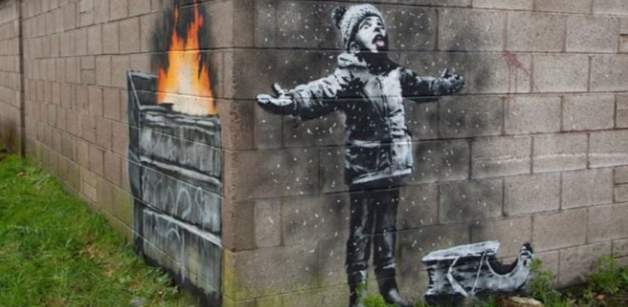 В 2018 году Бэнкси нарисовал граффити на гараже в Уэльсе. На стене изображен мальчик, который ловит языком падающие снежинки. Однако, если заглянуть за угол будет видна вторая часть рисунка, которая дает понять, что ребенок ловит не снежинки, а пепел из горящего мусорного бака. Гараж, на котором изображена картина, расположен там, где работает сталелитейный завод, и летом пепел с него покрывает дома и авто в городе.