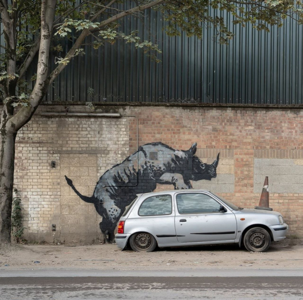 Изображение черного носорога, залезающего на автомобиль с конусом на капоте, появилось на улице Уэстмур в Чарлтоне на юго-востоке Лондона. Картина привлекает внимание к проблеме исчезновения носорогов.