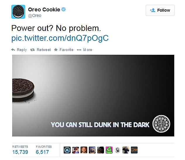 Ситуативным маркетингом называется использование актуального повода для продвижения бренда. Первым примером такого контента считается твит «Oreo», посвященный Суперболу. В 2013 году во время Супербола на половине стадиона пропал свет, и игру остановили до тех пор, пока специалисты не разберутся с электричеством. За это время SMM-щики Oreo успели придумать картинку, которая обыгрывала это событие, и опубликовать ее в Твиттере с актуальными хэштегами. В итоге твит разнеся по интернету, о нем написали такие издания, как Marshable и Forbes.