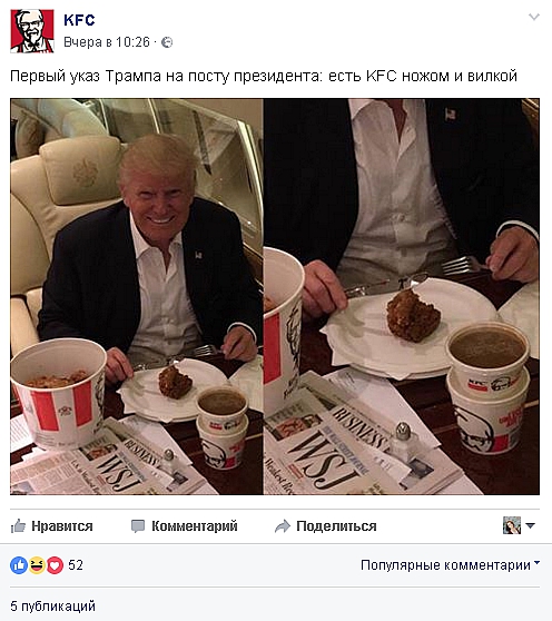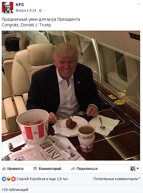 KFC поздравили Трампа "совместной" фотографией и предположили, что первый указ президента будет связан с их рестораном.