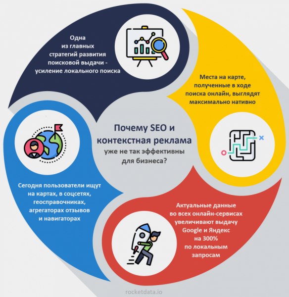 Борьба за первую строку в выдаче по запросам, связанным с поиском товаров или услуг, уже практически не имеет смысла. Ключевое значение приобретает наличие отметки на карте, причем не просто точки в радиусе поиска, а детальная информация: время работы, адрес, отзывы, действующие акции, фотографии.