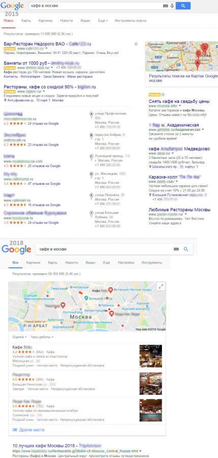 Всего за несколько лет алгоритмы формирования локальной и основной поисковой выдачи значительно изменились. И если три-четыре года назад в приоритете был перечень релевантных запросу ссылок, то теперь это, скорее, справочник с различными информационными модулями. По локальным запросам карта выходит на первое место, и только за ней — сайты с лучшими показателями SEO.
