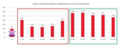 Анализ размещений на площадках с хорошей и плохой конверсией показал, что время суток, за вычетом небольших колебаний, не влияет на количество дошедших посетителей. В размещениях с плохой конверсией она плохая всегда. В размещениях с хорошей конверсией она практически не меняется в течении суток.