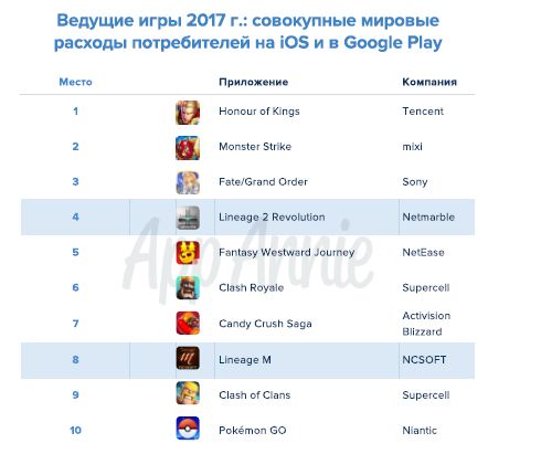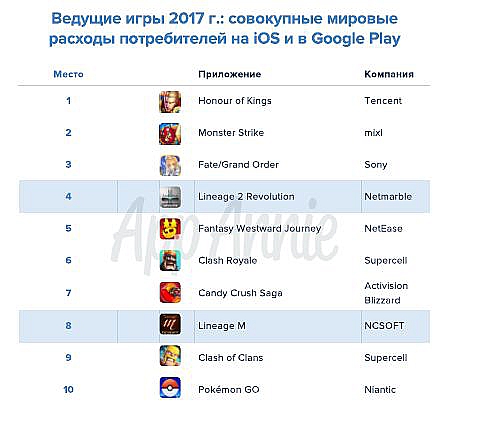 Удачный год выдался для Honor of Kings — благодаря популярности в Китае. По итогам IV квартала2017 года игра от Tencent стала самой используемой игрой в мире. Удвоила усилия на мобильном рынке франшиза Lineage — и смогла пробиться в число самых кассовых.
