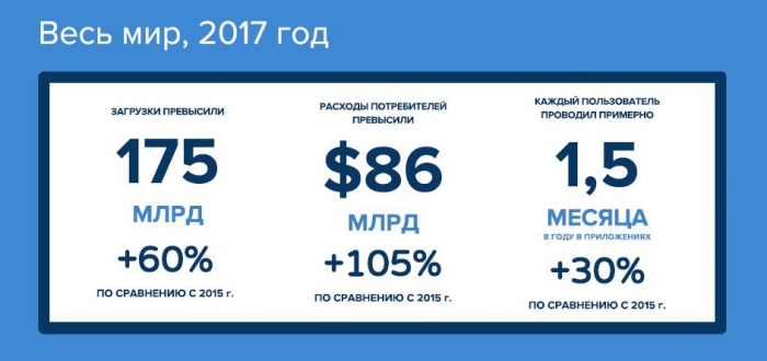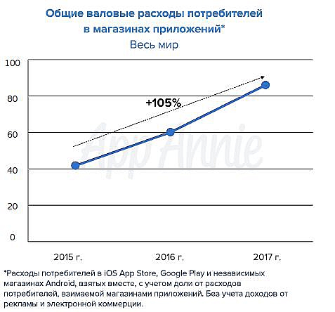 В 2017 году расходы потребителей в магазинах приложений превысили 86 млрд долларов, по сравнению с 2015 годом объем рынка более чем удвоился (+105%). Рост расходов будут поддерживать быстрые темпы внедрения смартфонов и приложений на формирующихся рынках, а также способность приложений перетягивать на себя значительную долю «кошелька» потребителей в развитых экономиках. Расходы в магазинах приложений уже на 70% превысили глобальные доходы от живой музыки и записей, на 195% — мировые кассовые сборы, на 70% — доходы от игр на ПК/консолях.