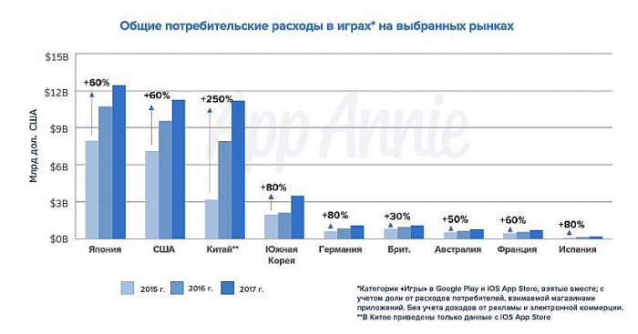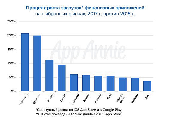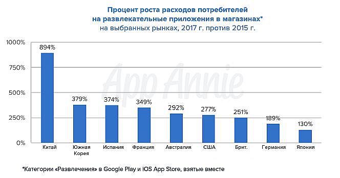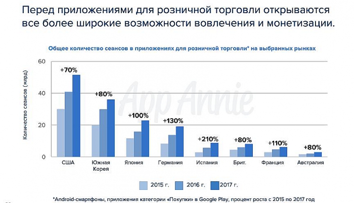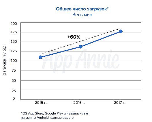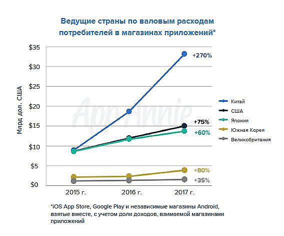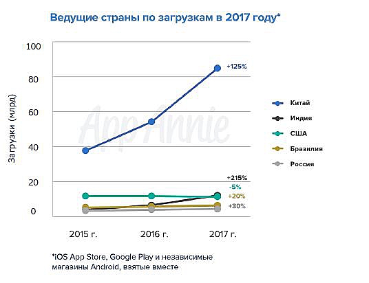 По итогам 2017 года Россия вошла в первую пятерку стран по загрузкам приложений, но по валовым расходам потребителей в магазинах приложений к лидерам пока не относится. Количество загрузок из App Store, Google Play и независимых магазинов Android в нашей стране выросло на 30%, говорится в отчете App Annie.
