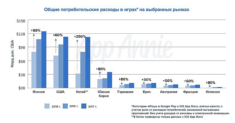 Монетизация на ведущих рынках продолжает стремительно расти. Китай стал настоящим генератором доходов, и темпы роста здесь только ускоряются. По прогнозам App Annie, подобная тенденция повторится и в других формирующихся экономиках — в России, Бразилии и Юго-Восточной Азии.