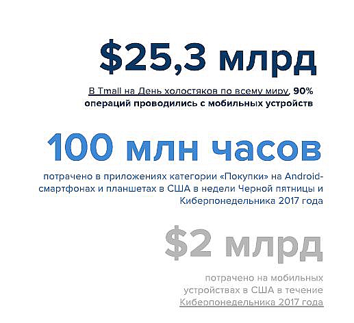 Возможности мобильного шопинга продемонстрировал ноябрь 2017 года — самый значительный месяц в его истории. В День холостяков (11 ноября2017 года) AliExpress занял первое место по загрузкам среди приложений категории «Покупки» в 69 странах на iPhone и в 38 странах на Android-смартфонах, что придало этому событию глобальный характер. Все дни, в которые загрузки приложений для покупок занимали первую позицию в Китае, Великобритании, США и по всему миру, — это либо День холостяков, либо соседние дни.
