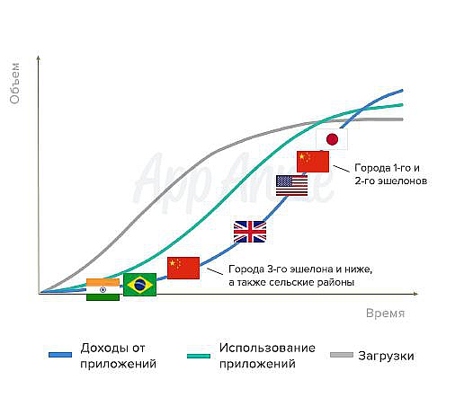 Четыре из пяти ведущих стран по загрузкам — рынки с формирующейся экономикой. App Annie прогнозирует, что по мере их «взросления» будут открываться колоссальные возможности для монетизации. Так, после внедрения в Индии субсидированного безлимитного доступа к 4G сети от Jio число загрузок подскочило на 215%, что позволило ей обогнать США. Однако развитые рынки сохраняют высокие абсолютные показатели загрузок. К примеру, в США пользователи в среднем скачивали по три приложения в месяц, а свыше 70% из них — хотя бы одно в месяц.
