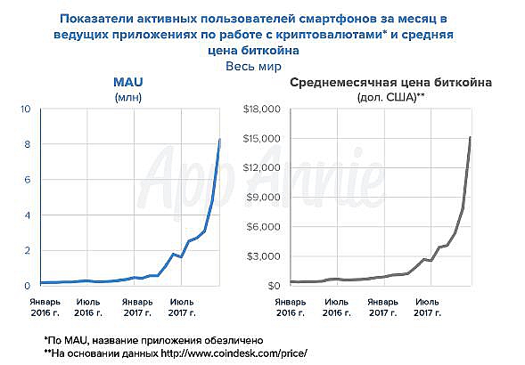 Быстрый рост цен на криптовалюты привел к созданию новой категории приложений, которые позволяют отслеживать динамику цен, вести счета и торговать валютами где и когда угодно. Показатели приложений по работе с криптовалютами тесно связаны с ценами активов и воодушевлением покупателей.