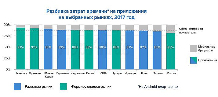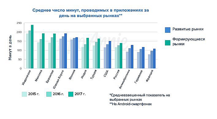 В среднем потребители проводят в Android-приложениях по 3 часа в день. С 2015 года этот показатель вырос более чем на 30%. Анализ выбранных рынков показал, что пользователи смартфонов проводят в нативных приложениях в 7 раз больше времени, чем в мобильных браузерах, и заходят в них в 13 раз чаще. Это открывает перед бизнесом большие возможности.