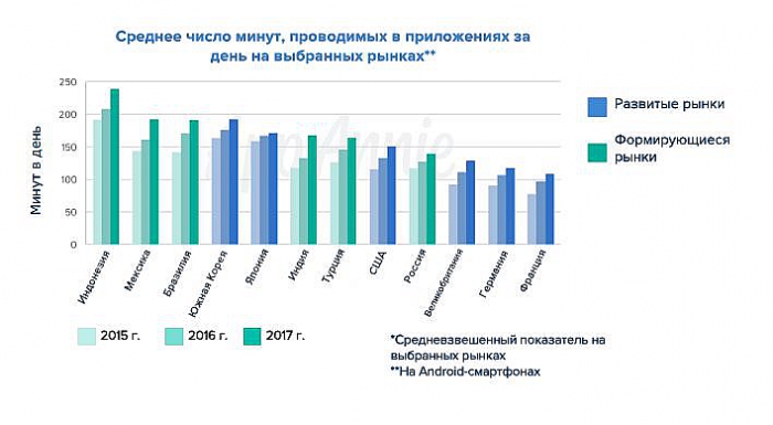 По прогнозам App Annie, в 2018 году Китай сохранит ведущую позицию по показателю затрат пользователей в магазинах приложений. По показателю затрат времени на Android-устройствах будут лидировать формирующиеся рынки во главе с Индией и Бразилией.