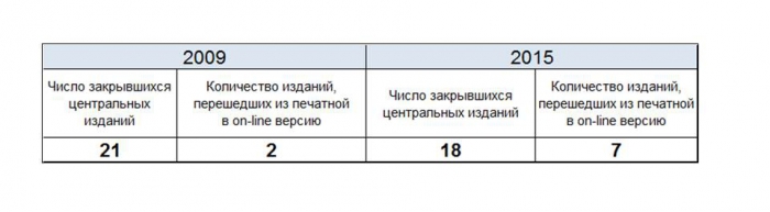 Елена Белова: "Спецификой текущего периода является следующее: если в 2009 году речь шла о полном исчезновении печатных изданий с рынка, то сейчас во многих случаях мы говорим не об исчезновении издания как проекта, а об изменении канала подачи информации - печатные СМИ становятся on-line проектами. Значительная часть из закрытых в начале 2015 года изданий продолжает свое существования в интернете".