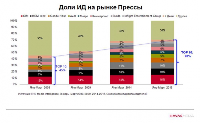 Тенденция концентрации бюджетов рекламодателей в ключевых издательских домах и изданиях зародилась во время кризиса 2009 года. За прошедшие годы данный тренд стремительно набирал обороты и в итоге, в первом квартале 2015 года, 70% инвестиций рекламодателей сконцентрировались в 10 ключевых ИД.