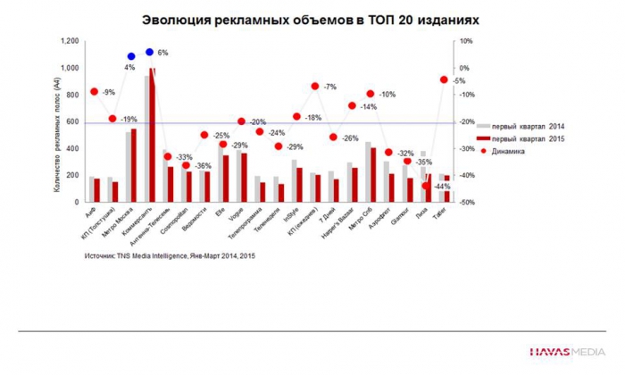 Более заметно падение рекламных объемов в изданиях, ориентированных на Beauty (Cosmopolitan, Glamour) и mass-market (7 Дней, Лиза, Антенна-Телесемь, Теленеделя).