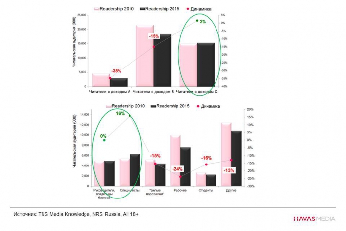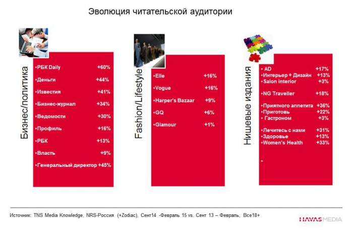 Аудитория традиционных охватных изданий сокращается. При этом наблюдается рост интереса (соответственно, и увеличение читательской аудитории) у более нишевых сегментов прессы. Наиболее позитивная динамика наблюдается в таких сегментах, как: