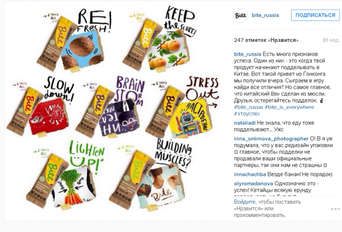 Китайцы действительно преуспели в копировании дизайна самых разных брендов, начиная с одежды и заканчивая автомобилями. Однако, есть и более конкретный пример, который, по иронии судьбы, вновь касается батончика Bite. В 2014 году на выставке в Гон-Конге была замечена копия продукта, о чем BioFoodLab также сообщили сразу на своих страницах в социальных сетях, чтобы покупатели были внимательны.