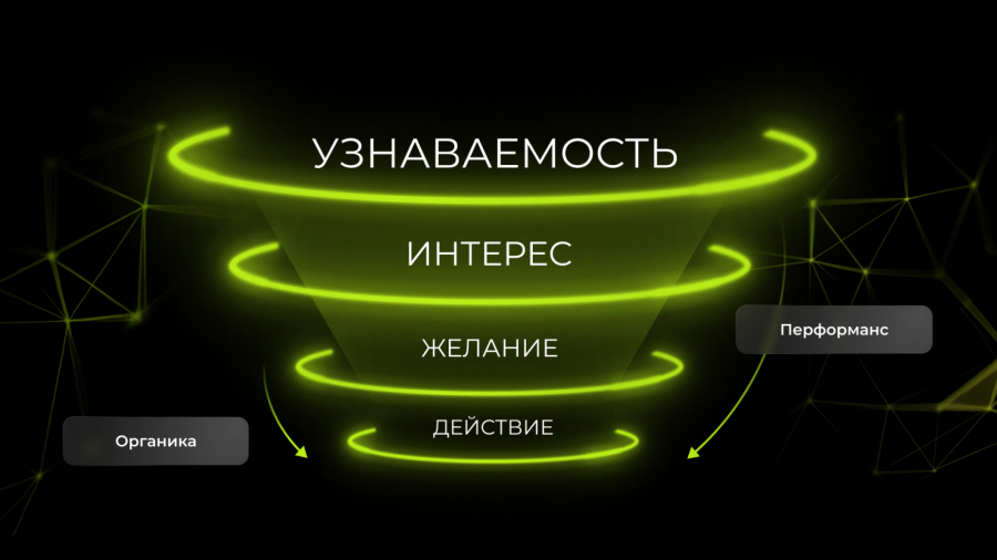 Во-вторых, если рассмотреть классическую воронку продаж и то, как именно платные источники и органика влияют на пользователя, можно увидеть, что органический трафик — это пользователи, находящиеся на последнем этапе. Они уже знакомы с брендом, обладают сформированной потребностью и совершают целевое действие: самостоятельно находят приложение и устанавливают его. Однако на них могли повлиять источники из медиасплита, включая перформанс-каналы, которые работают как на верхнем, так и на нижнем уровнях воронки.