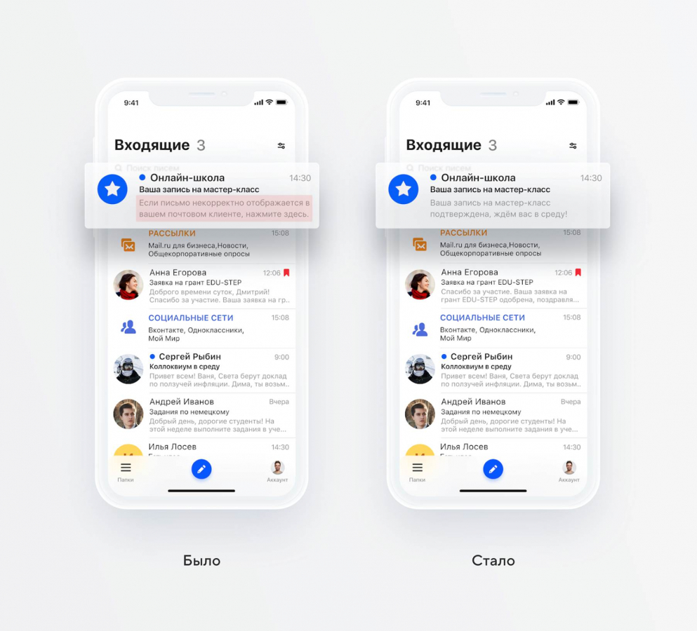 Благодаря умным уведомлениям стало проще выделять важные письма в растущем потоке писем. Теперь с первого взгляда на экран смартфона или на панель со списком сообщений становится понятно, о чем письмо и насколько оно срочное. Новая функция помогает пользователю сосредоточиться на главном и экономит его время.