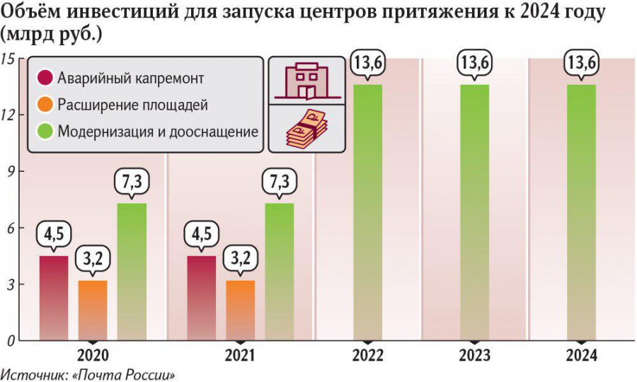 Компания посчитала, что ей потребуется 85 млрд рублей. Из них 66,4 млрд пойдут на техническую модернизацию и дооснащение отделений, 10,8 млрд заложены на проведение капитального ремонта, а 7,7 млрд рублей — на расширение площадей отделений. В документе описываются три новых формата: ППС (пункт почтовой связи), ПОПС (передвижные отделения) и МОПС (модульные отделения). Именно эти форматы и носят название «Центры притяжения».
