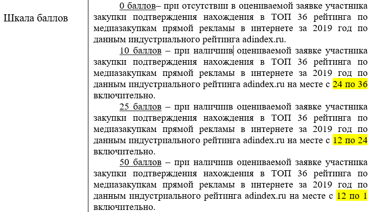Кроме того, ухудшились условия оценки по параметру «Нахождение участника в ТОП 36 рейтинга по медиазакупкам прямой рекламы в интернете за 2019 год по данным индустриального рейтинга adindex.ru» для всех участников ниже 12 места, указал он.