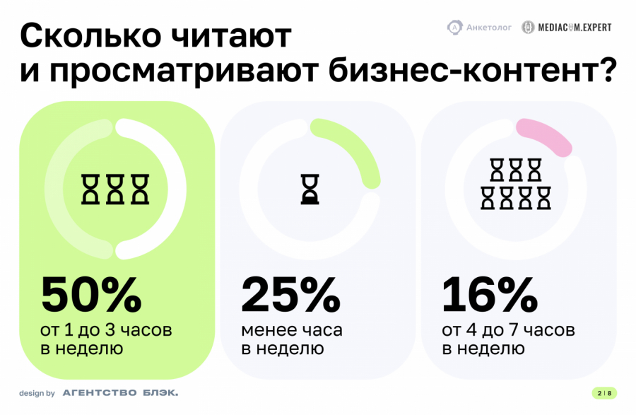 Половина респондентов уделяют чтению и просмотру бизнес-контента от одного до трех часов в неделю, четверть — меньше часа. От четырех до семи часов в неделю на изучение новостей о бизнесе уходит у 16% опрошенных, больше семи часов — у 7%.