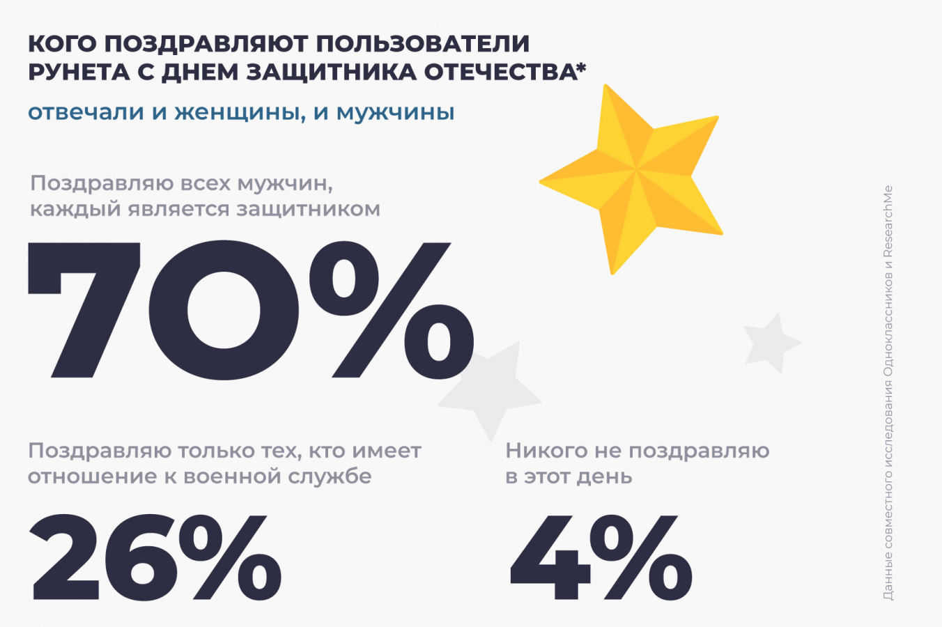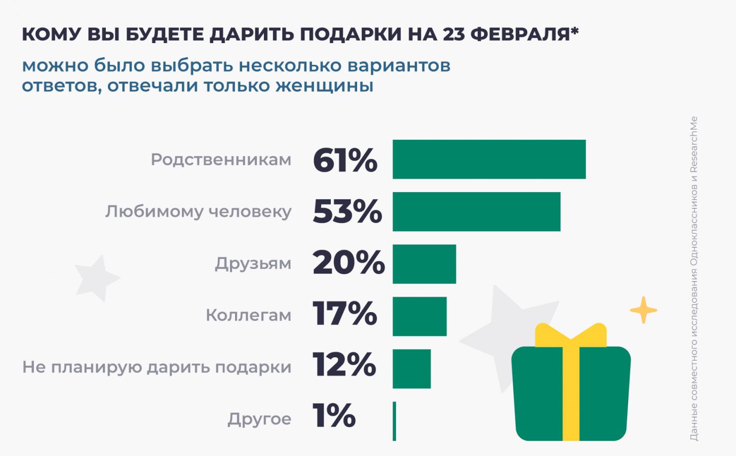 «Одноклассники» и ResearchMe выяснили, какие подарки ожидают мужчины к 23 февраля. Sostav ознакомился с результатами опроса. Отмечать День защитника отечества будут только 54% респондентов. 40% мужчин заявили, что День защитника Отечества хотели бы провести как настоящий праздник и получить больше заботы от женщин, а 28% считают, что в этот день мужчина сам должен заботиться о близких.