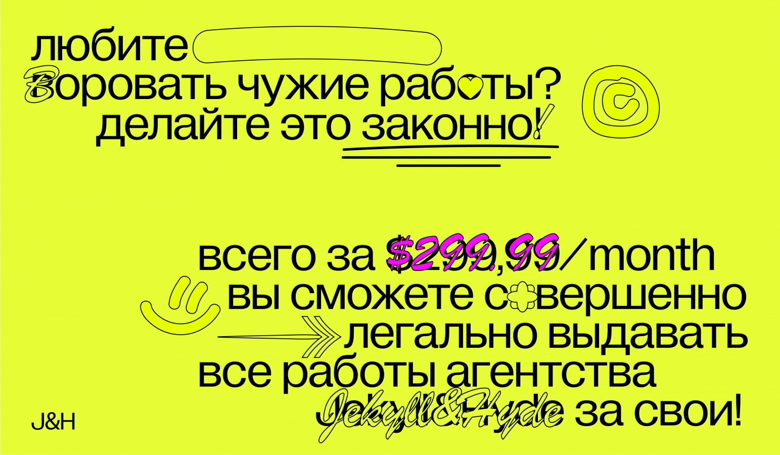 Jekyll&Hyde часто сталкивались с воровством кейсов другими агентствами и решило выставить на продажу лицензию на свое портфолио. Чтобы получить работы, компаниям нужно оставить заявку на сайте со списком проектов, лицензию на которые хотели бы приобрести. Наиболее часто воруемые работы стоят дороже остальных. На лендинге можно увидеть множество ироничных слоганов, вроде «обманывай первый месяц бесплатно», «теперь вы можете зарабатывать на мастерклассах» и «с помощью этих работ вы обманите больше людей». Подробнее на Sostav.