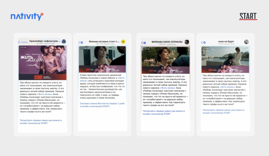 Большая рекламная кампания нового сериала «Жить жизнь» от онлайн-кинотеатра START проходила в мае по различным каналам — наружная реклама, спонсорство на тв, интернет и соцсети. Для охвата аудитории кинолюбителей в Telegram была запущена кампания на платформе Nativity — промо-посты с видео-тизерами нового сериала и возможностью перехода на сайт.