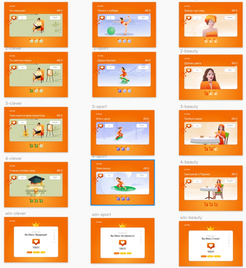 Игра представляет собой интерактив в двух направлениях — для мужчин и для девушек. Выбрав пол на стартовой странице игры, участник попадает в игру «Wifire воины интернета» или «Мисс Wifire».