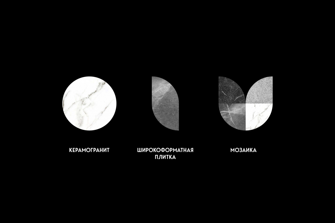 Фирменный стиль полностью построен на фактуре керамогранита. Это черно-белая минималистичная и брутальная айдентика в сочетании с керамогранитными паттернами.