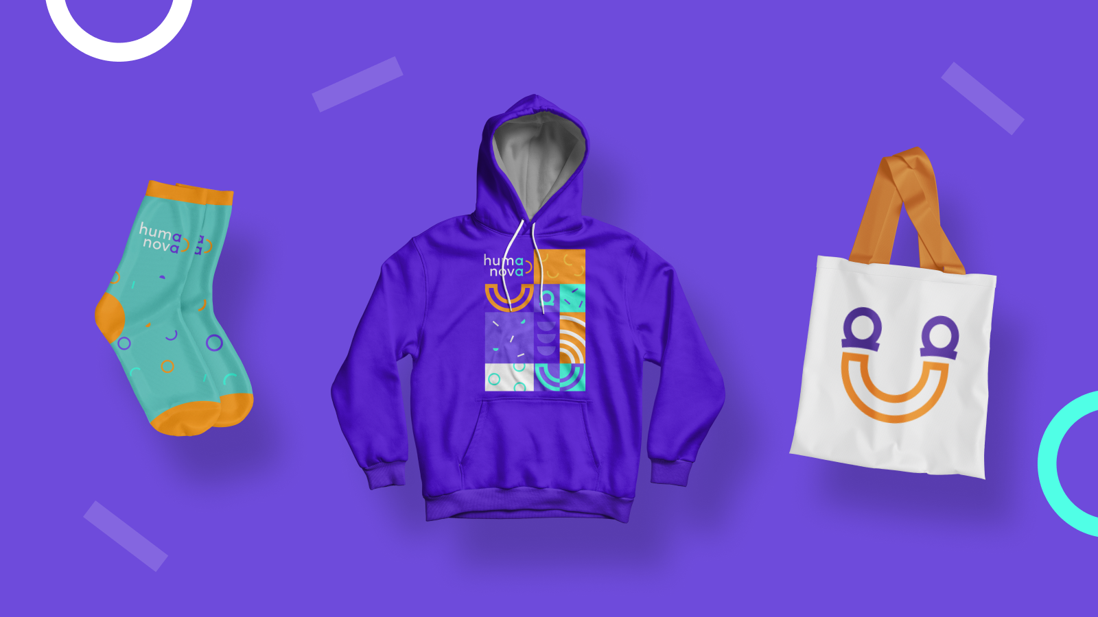 Название проекта означает поиск новых людей и возможность стать лучшей версией себя, поэтому шрифтовой логотип разделен на две смысловые части — «huma» и «nova». Улыбка из логотипа превратилась в паттерн, который подчеркнул дружелюбный образ бренда.
