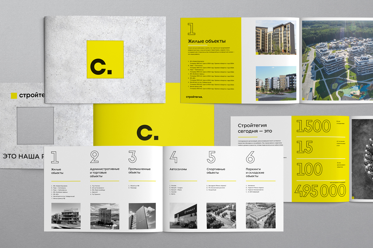 Универсальность фирменного стиля, построенного на сочетании белого и желтого цветов, текстуры камня, позволила легко забрендировать корпоративные и рекламные носители.