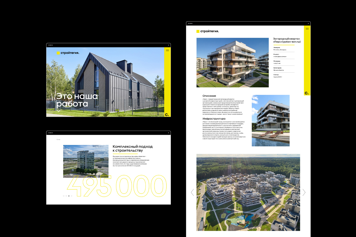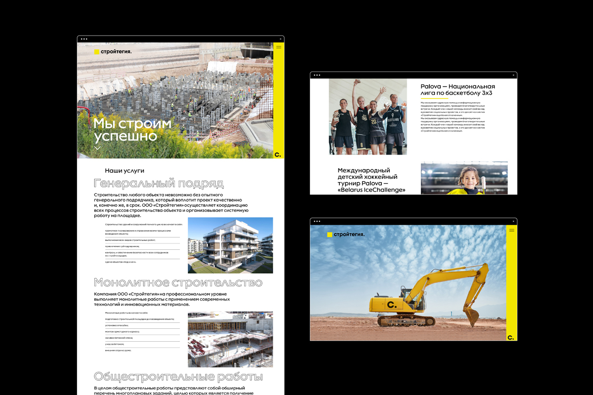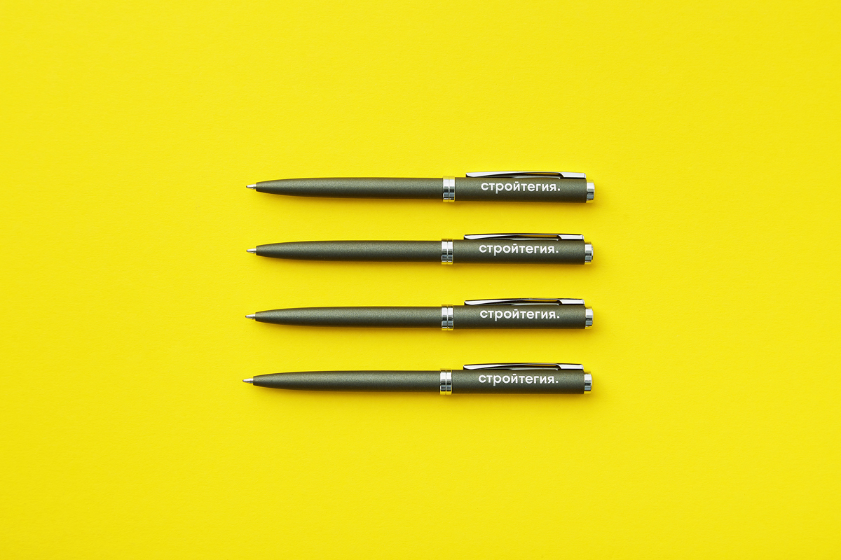Компания клиента — сплоченная команда опытных профессионалов, способных работать с проектами любой сложности, умеющих эффективно взаимодействовать с заказчиками, проходя все этапы строительства вместе. Эту идею продолжило название бренда — «Стройтегия» как фантазийное слияние слов «строить» и «стратегия». Нейм сообщает о способности команды гармонично сочетать физический и умственный труд, доносит миссию бренда — осмысленное строительство. Послание дополняет лаконичный слоган «Это наша работа».