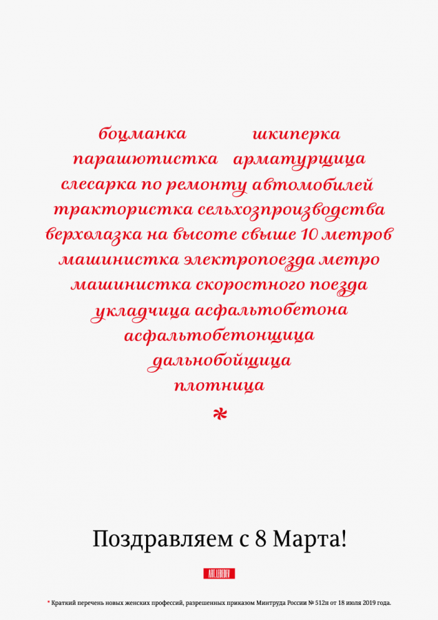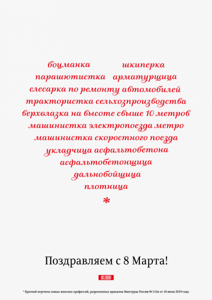 В принте дизайнеры упомянули укладчицу асфальтобетона, машинистку скоростного поезда и арматурщицу — рабочие специальности, которые ранее относили к «мужским», а с 1 января 2021 года приказом Минтруда России № 512н от 18 июля 2019 года стали доступны женщинам. Подробнее на Sostav.