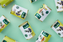 Дизайн состоит из трех элементов — крафтовой бумаги, яркого броского лого, похожего на геометку, и милого деревенского пейзажа, выполненного в зеленых тонах, создающего настроение уюта и гармонии.