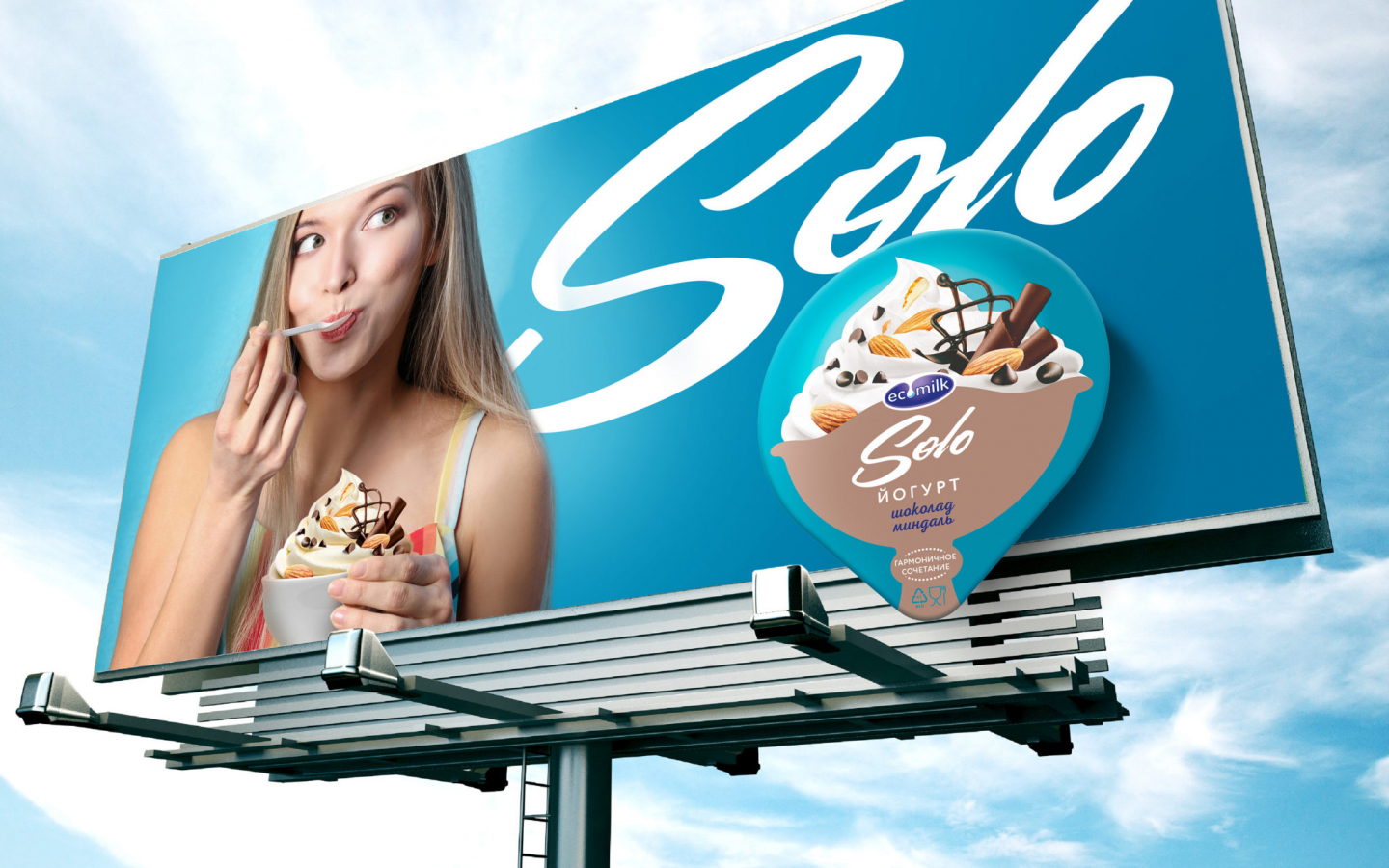 Ложковые йогурты Solo продолжили тему изысканных десертов и необычных вкусов. Центральное место в композиции занимают невероятные фудзоны, каждая из которых, по словам дизайнеров, является произведением искусства. Дополнительная дифференциация вкусов в линейке происходит за счет цветов креманок.