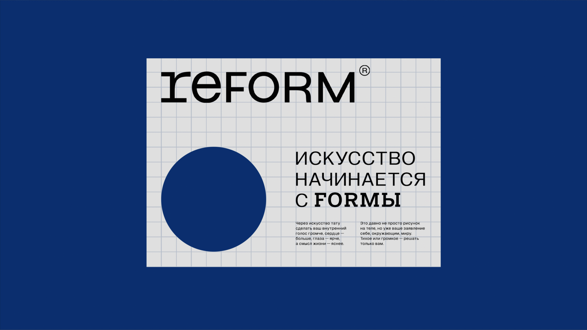 Изменения основаны на концепции reFORM, означающей преобразования, улучшения и метаморфозы в человеческой жизни. Это переосмысление себя через заявления без слов — послания и рисунки на теле в виде татуировки.