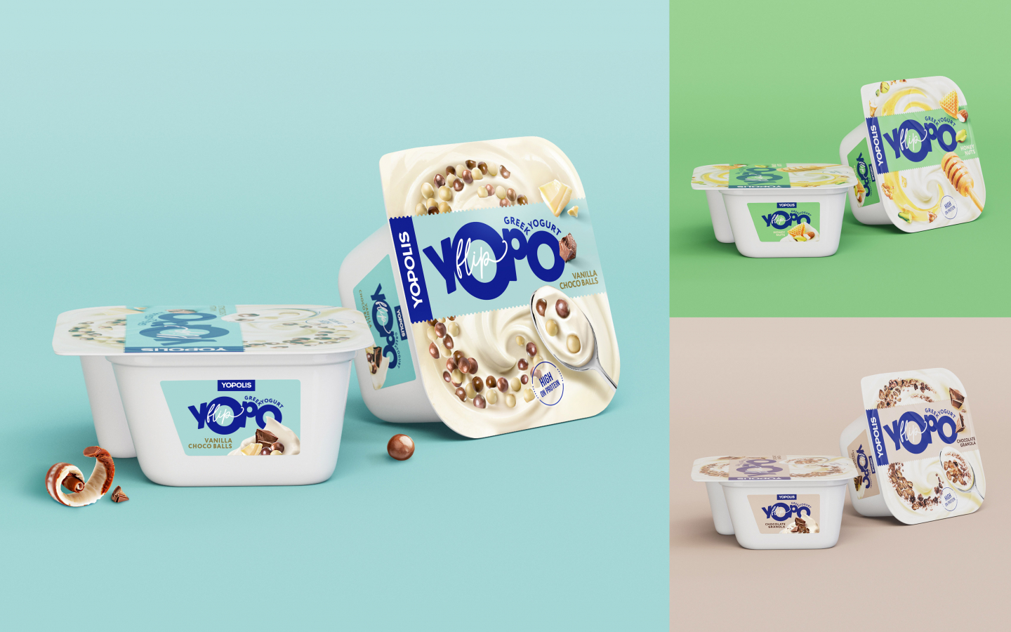 Yopo Flip — двухсекционные йогурты, в одной из которых находится йогурт, а в другой — топпинги. Дизайн новинки состоит из фудзоны, которой отдана большая часть упаковки. Логотип расположен на цветной полосе, которая меняется в зависимости от вкуса.