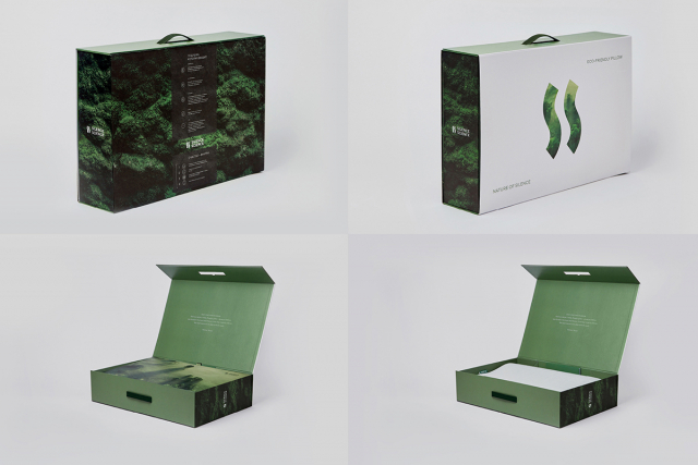 Ключевой элемент оформления коробки — графический знак лого, играющий роль «вырубного окна» в мир флоры. Его поддерживают атмосферные фразы и текстура натурального мха. Знак Ecology of sleep говорит о том, что подушка прошла тестирование и дает гарантии: изделие произведено из экоматериалов, обладает высокими ортопедическими свойствами, улучшает качество сна при длительном использовании.