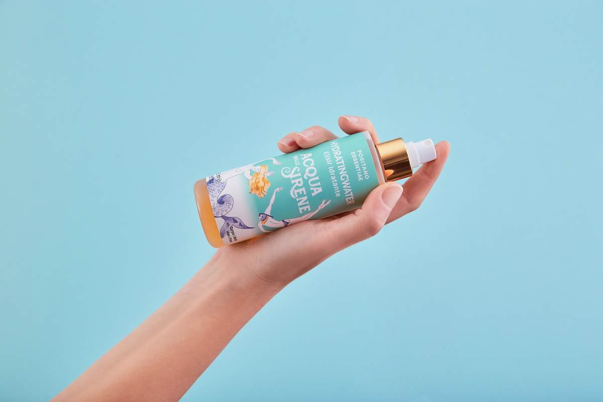 На логотипе Positano Essentiae — фрагмент античной фрески. Здесь изображена богиня здоровья Гигея на морском коне, и этот образ отлично передает характер и происхождение бренда.