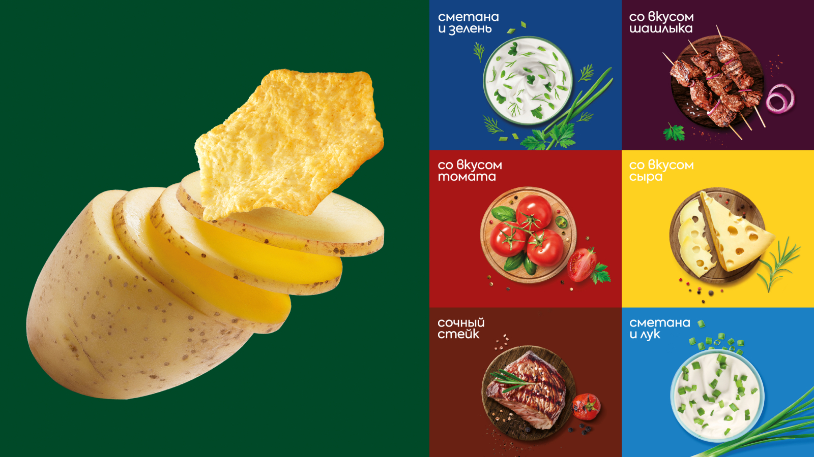 При помощи брендингового агентства Depot типографика стала более мягкой и скругленной. Цвета обводки зоны с логоблоком теперь соответствуют цветовому кодированию вкусов: голубой — сметана и зелень, зелёный — лук, коричневый — стейк и так далее. Оттенки упаковок, в свою очередь, стали более яркими и аппетитными.