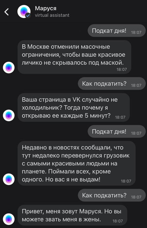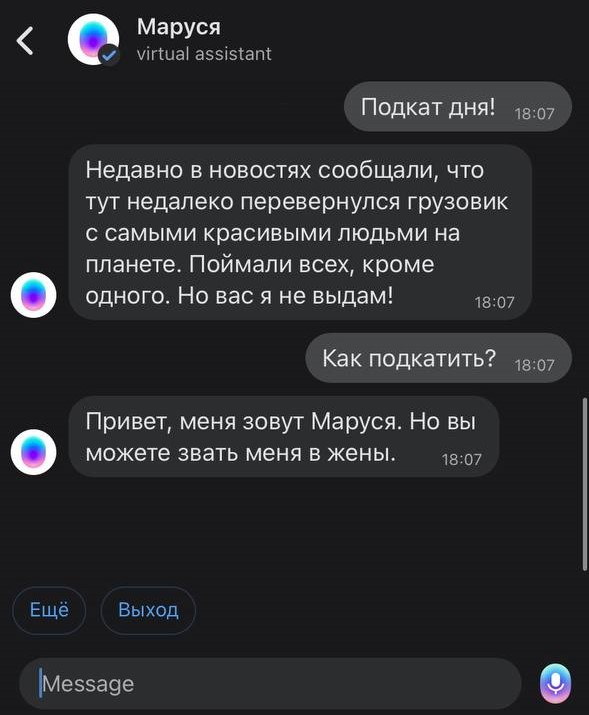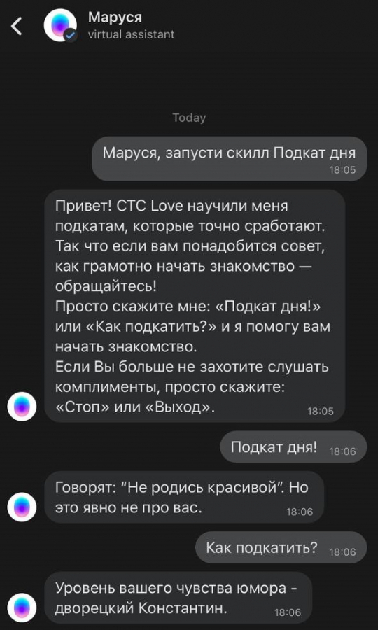 Голосовой ассистент Маруся готова каждому преподать урок пикап-мастерства — начать обучение можно было с помощью кодовой фразы. Например, «Маруся, скажи комплимент» или «Маруся, как подкатить к парню/девушке?». Подробнее на Sostav.