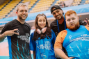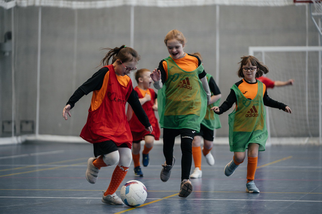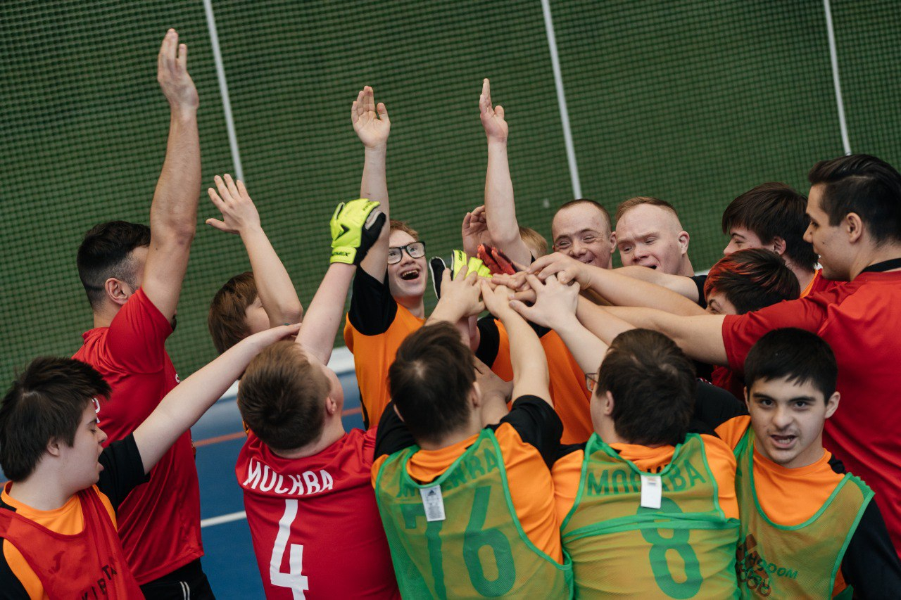 На снимках представлены дети с синдромом Дауна и волонтёры-наставники на различных мероприятиях, а также игроки сборной по адаптивному футболу.