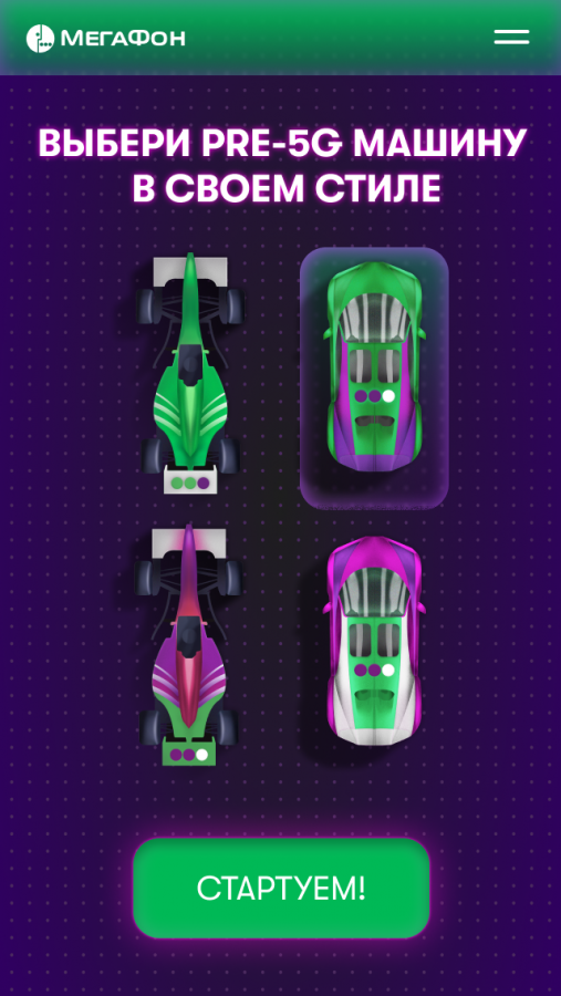 «МегаФон» организовал гоночный турнир «Со скоростью первых!» в поддержку опции pre-5G. На старте состязаний гаджет игроков становится болидом, задача которого всего за одну минуту раздать заряд pre-5G смартфонам жителей виртуального города.
