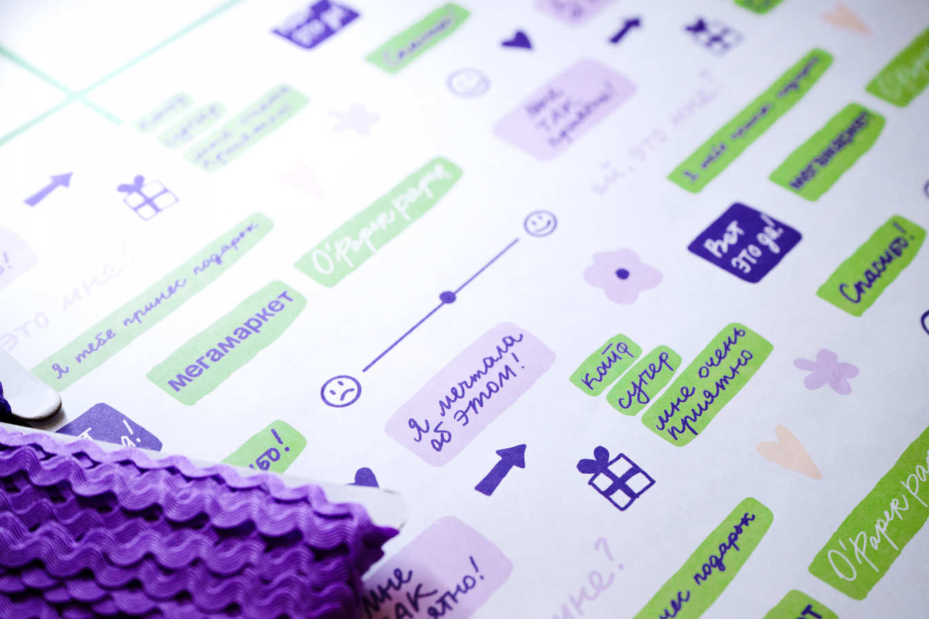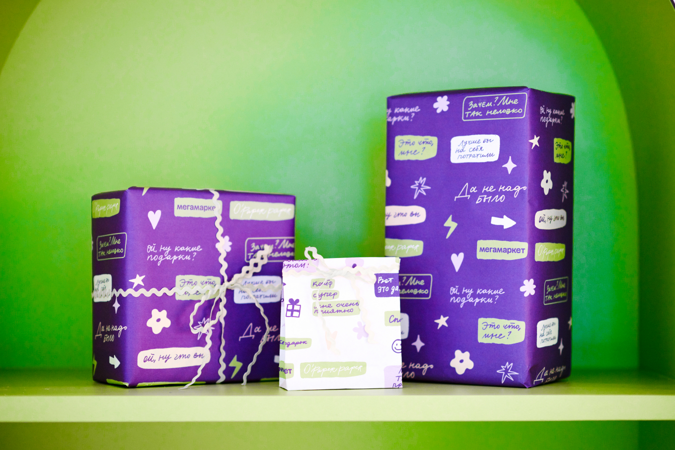 Специально для проекта совместно с иллюстраторами O Paper Paper «Мегамаркет» создал двустороннюю упаковочную бумагу: с одной стороны, напечатаны фразы в духе «Ой, ну что вы» и «Мне так неловко», а с обратной — много настоящих благодарностей.