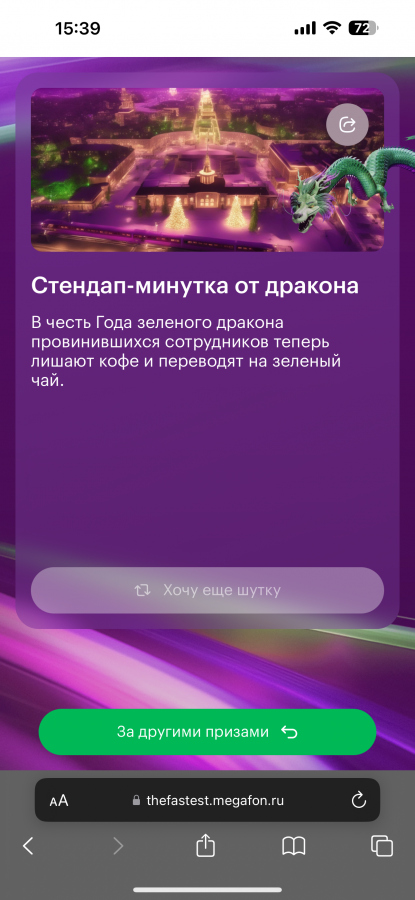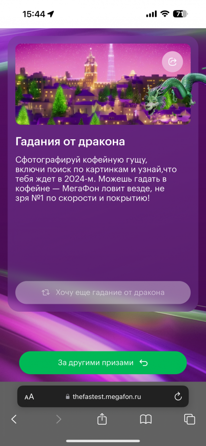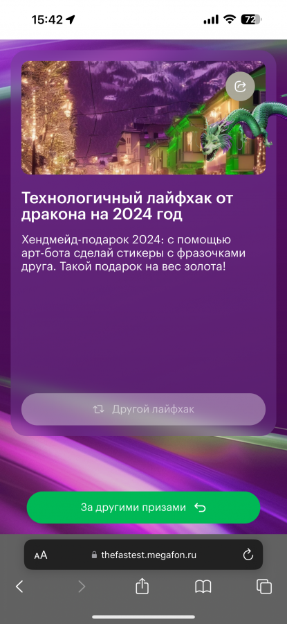 Дракон выдавал развлекательный нативно брендированный контент: эксклюзивный стикерпак, шутки, зимние рецепты, приметы и гадания, лайфхаки и персонализированные предсказания на 2024 год на основе информации об участнике. Весь контент создавал искусственный интеллект.